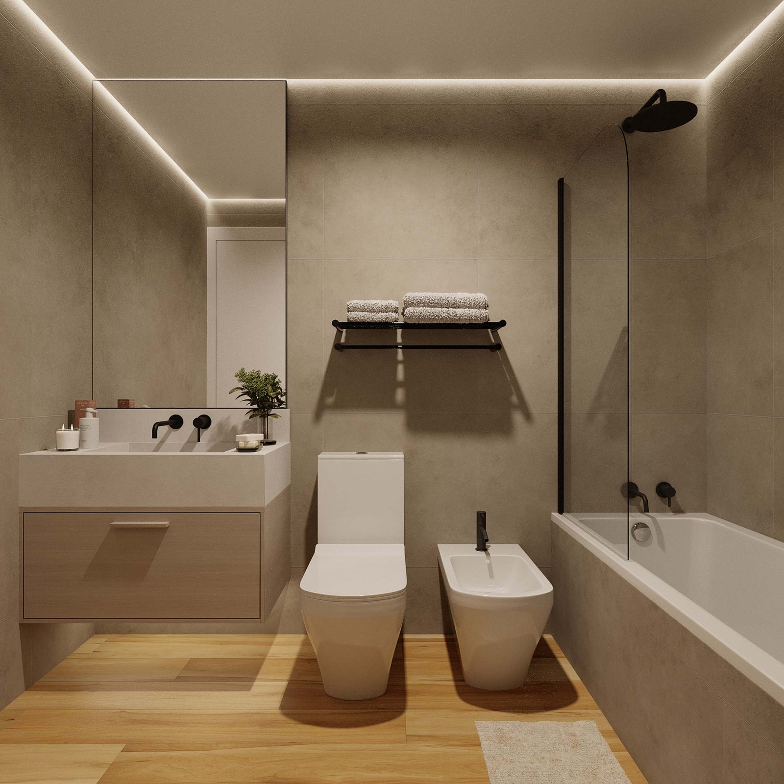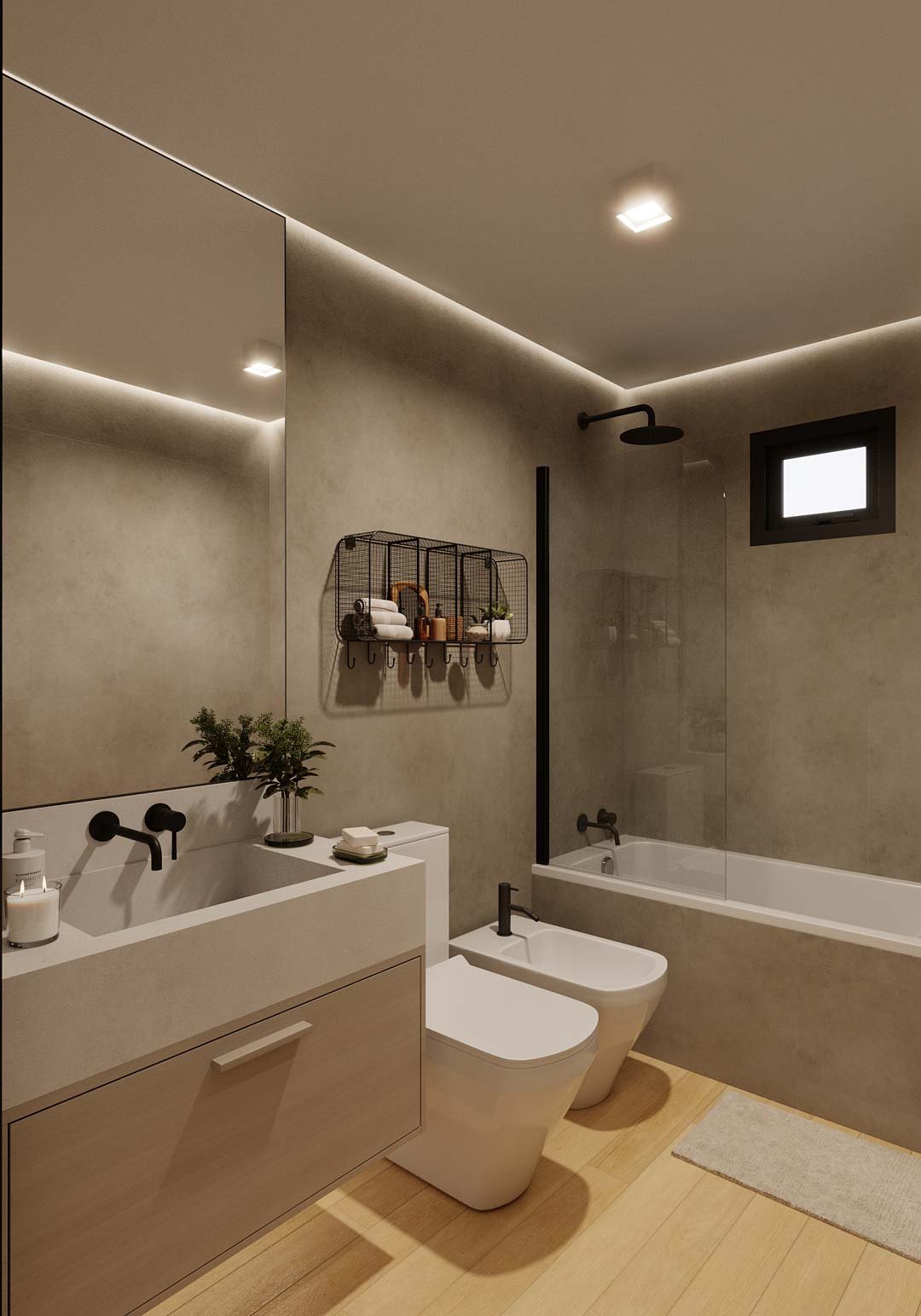 En baños, pisos y revestimientos en porcelanatos símil mármol.