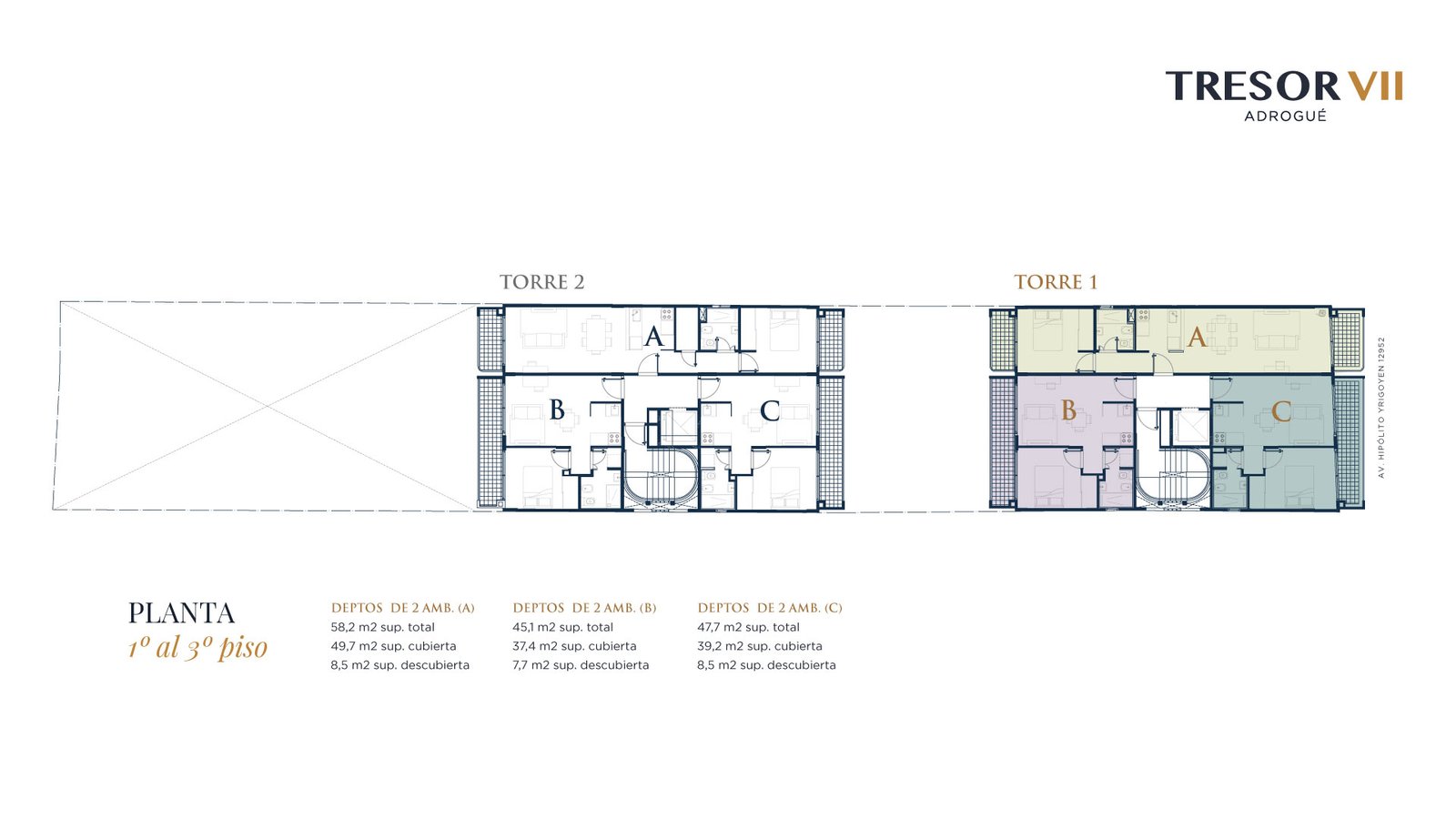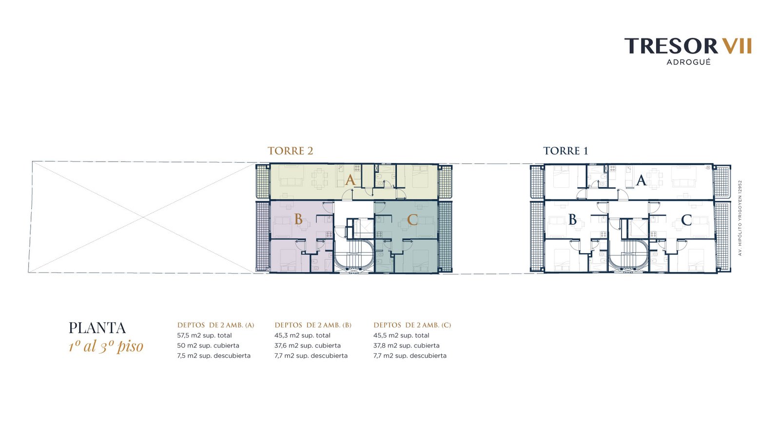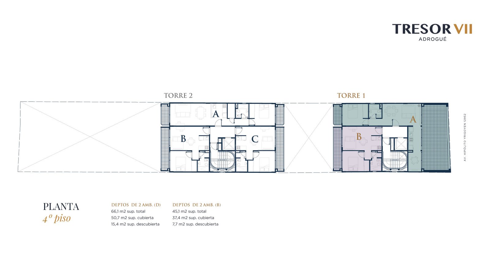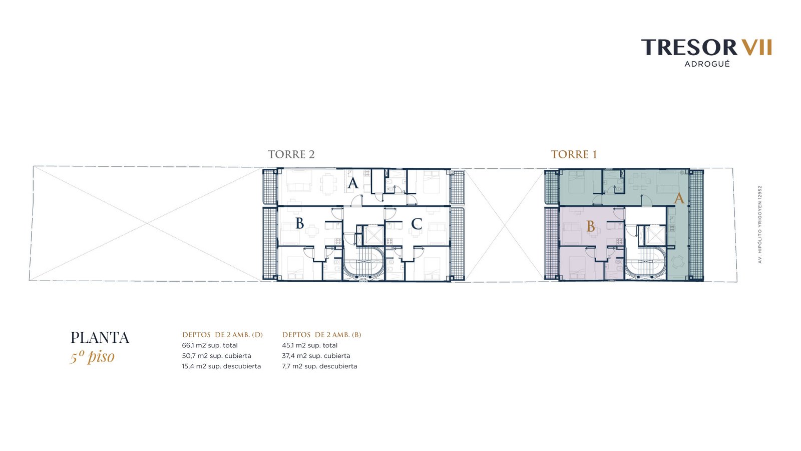 Dos torres de 5 niveles. Patio interno, que favorece la ventilación y la luminosidad.28 unidades de 2 ambientes de 45 a 66 m². Todas las unidades poseen cochera propia.