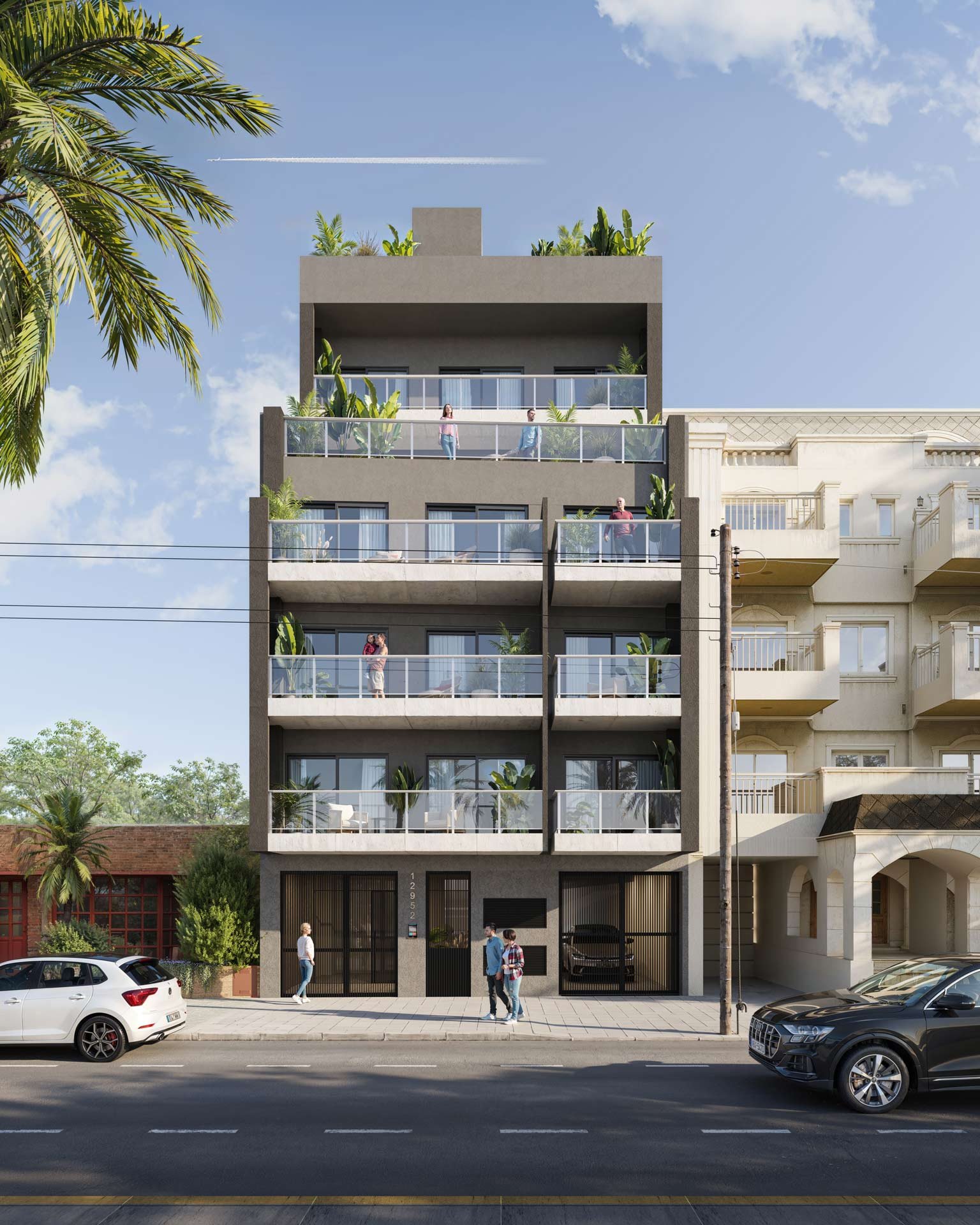 La fachada del edificio combina materiales modernos como revoque texturado tipo Tarquini y hormigón visto, aportando identidad y distinción a la propuesta arquitectónica