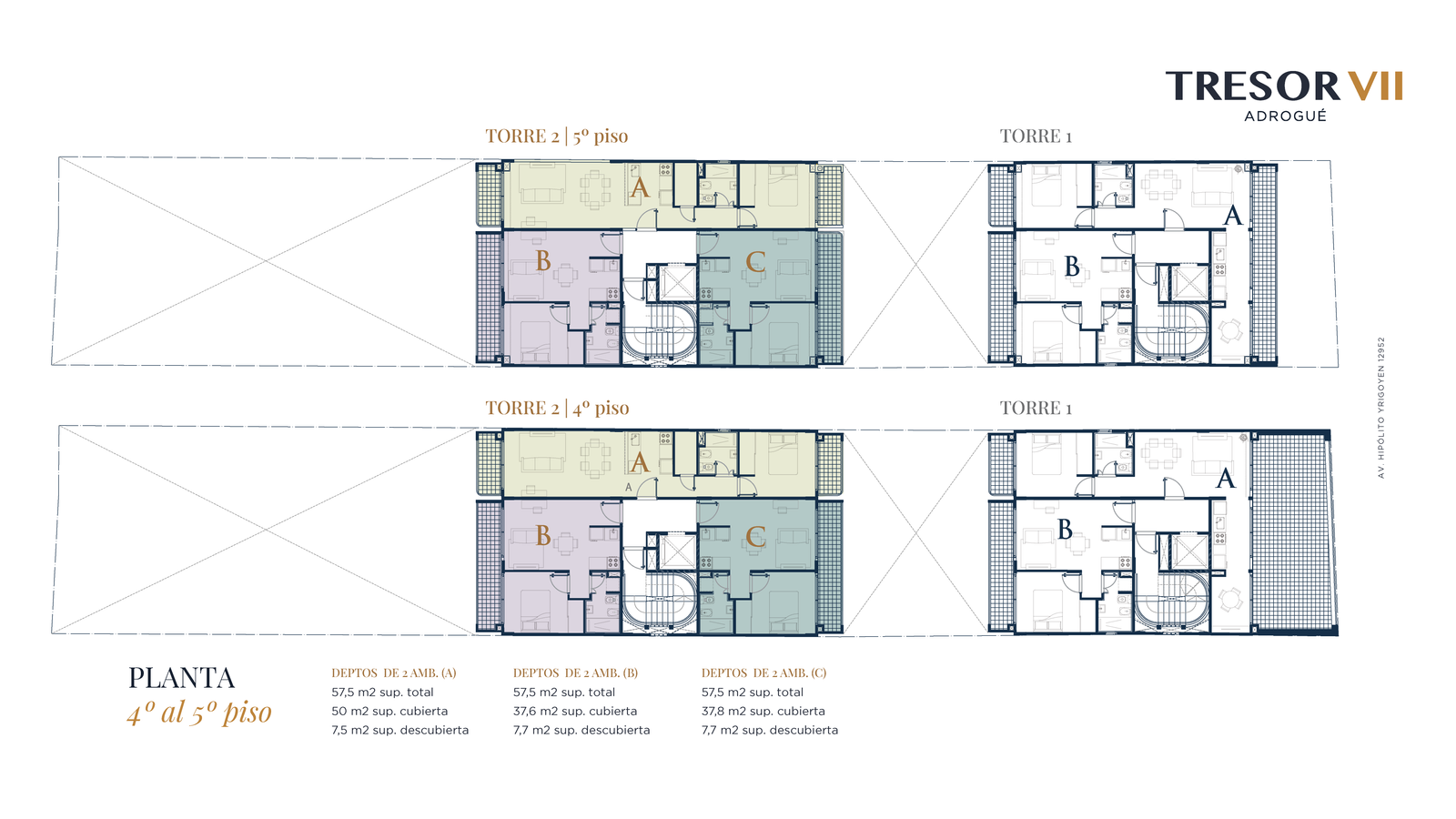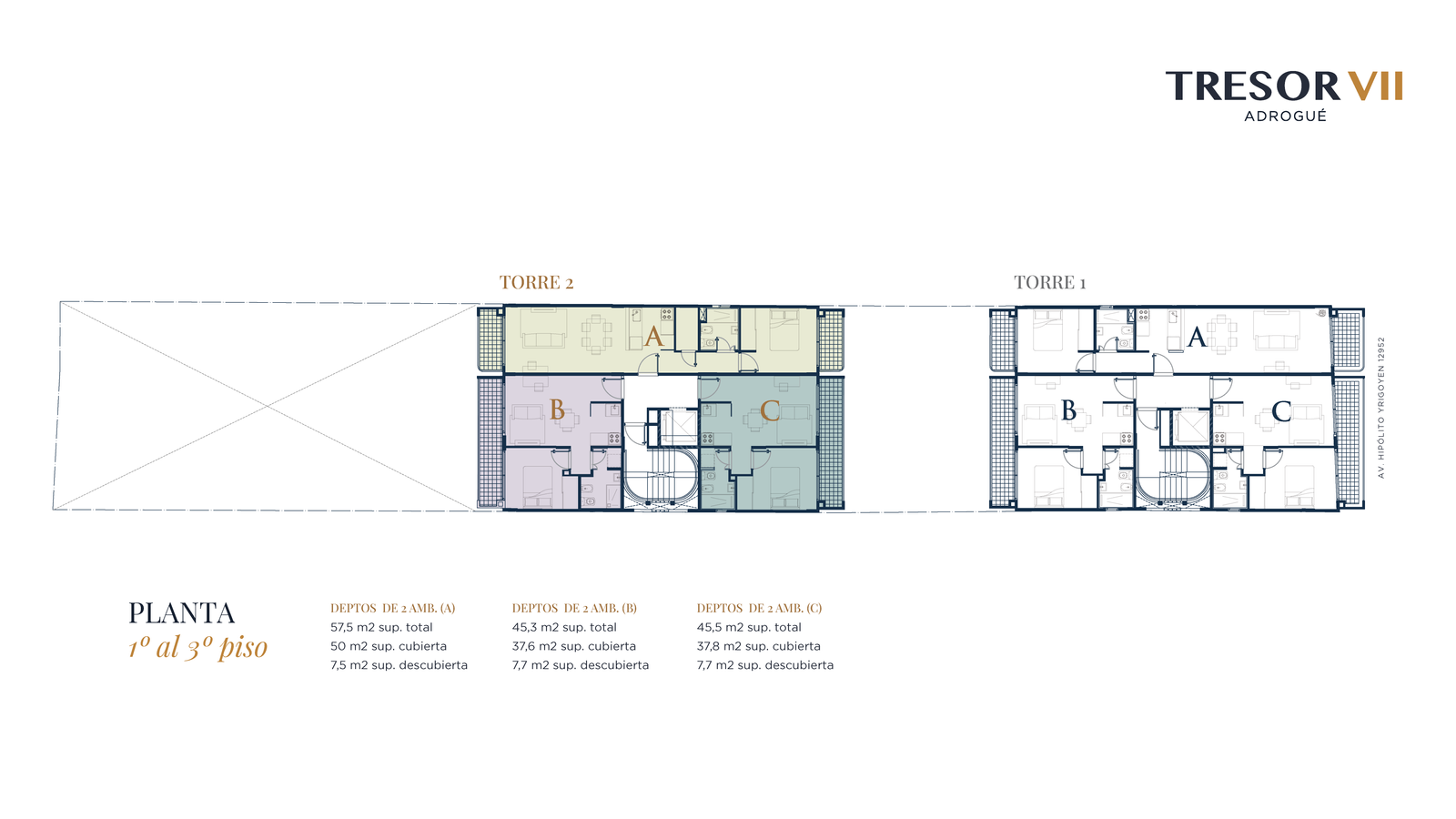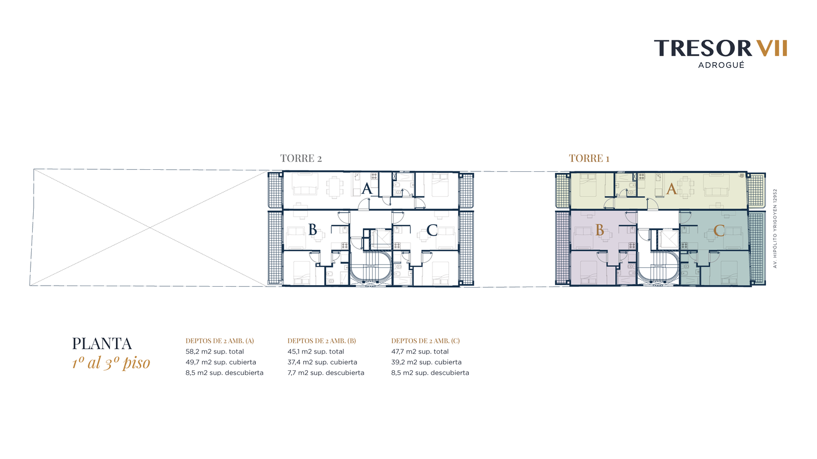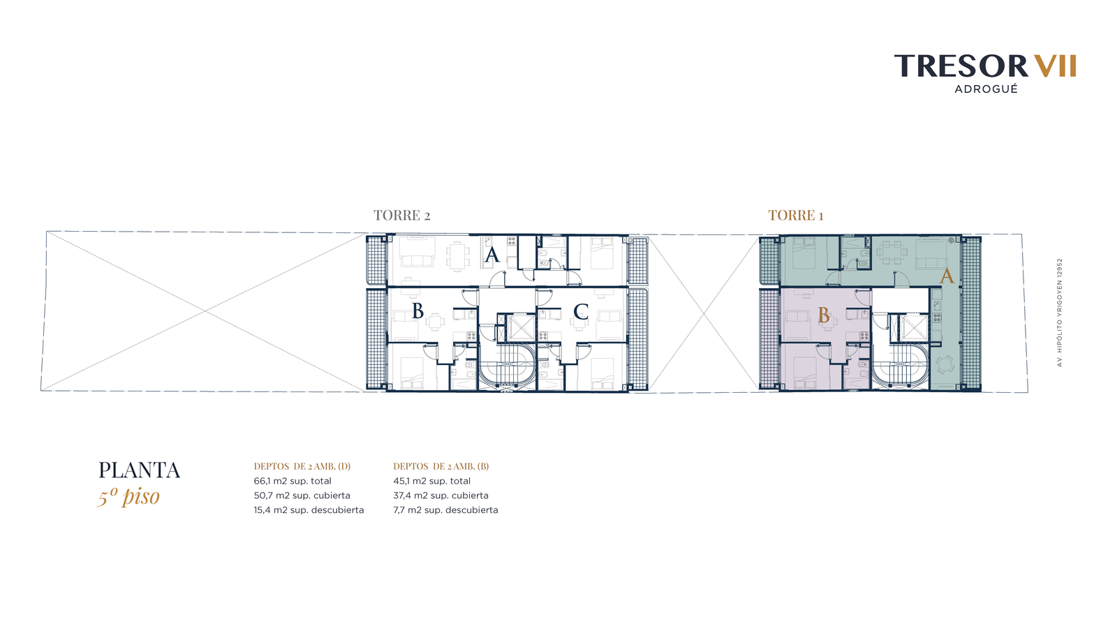 Dos torres de 5 niveles. Patio interno, que favorece la ventilación y la luminosidad. 28 unidades de 2 ambientes de 45 a 66 m². Todas las unidades poseen cochera propia.